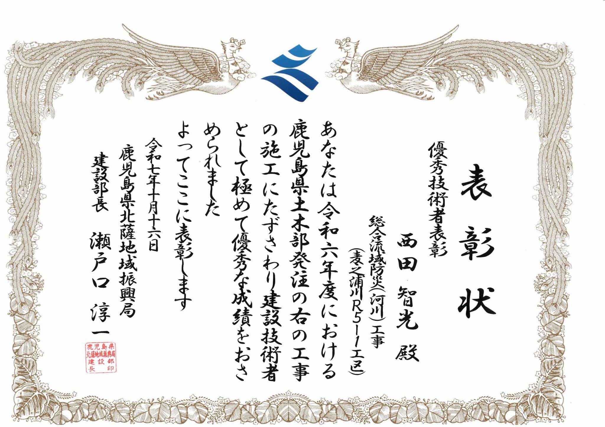 ニュース 2025.10.21 北薩地域振興局より優良工事表彰・優秀技術者表彰をいただきました! 優良工事表彰をいただきました。現場:総合流域防災(河川)工事(麦之浦川R5-1工区) 優秀技術者 西田 智光 表彰をいただきました!
